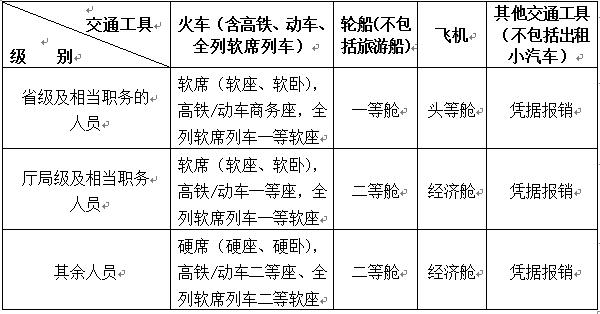 第七條 出差人員應當按規定等級乘坐交通工具。出差人員乘坐交通工具的等級見下表: