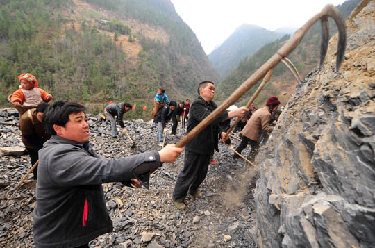 2004年下半年,路開始修了。由于年輕人大都出去打工,留守在家的多是婦女和老人,能上陣的只有百余號人,其中不少老人還要一邊照看孩子一邊勞作。