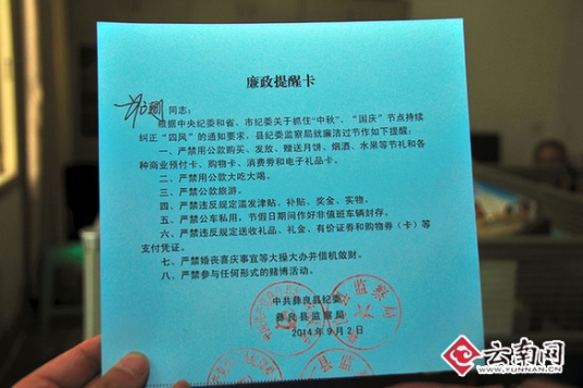 彝良紀委監(jiān)察部門向各級領導干部發(fā)放的“廉政提醒卡”