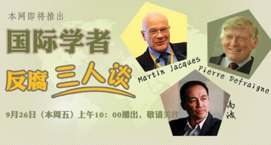 9月26日(周五)上午10:00,中央紀委監察部網站《反腐三人談》節目將邀請皮埃爾·德福安、馬丁·雅克、高波圍繞反腐敗話題做客在線訪談,敬請關注。