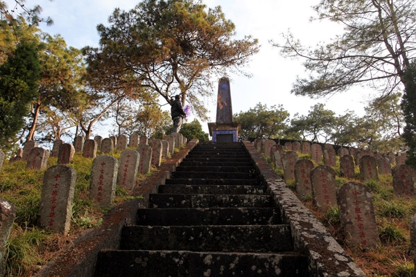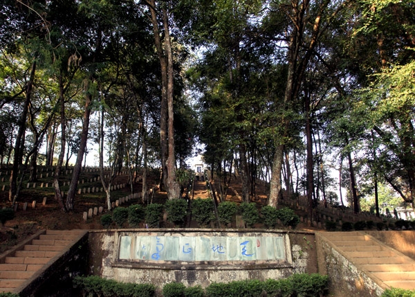 這座半圓形的小團(tuán)坡(地名)上,安葬著攻克騰沖最后一次戰(zhàn)役——騰沖城攻堅(jiān)戰(zhàn)犧牲的3000多名遠(yuǎn)征軍將士遺骨。整個(gè)小團(tuán)坡以最上方的紀(jì)念塔為中心呈四面八方放射狀排列,以中軸對稱線排列,左邊安葬的是二十集團(tuán)軍五十三軍陣亡將士;右邊安葬的是二十集團(tuán)軍五十四軍陣亡將士。