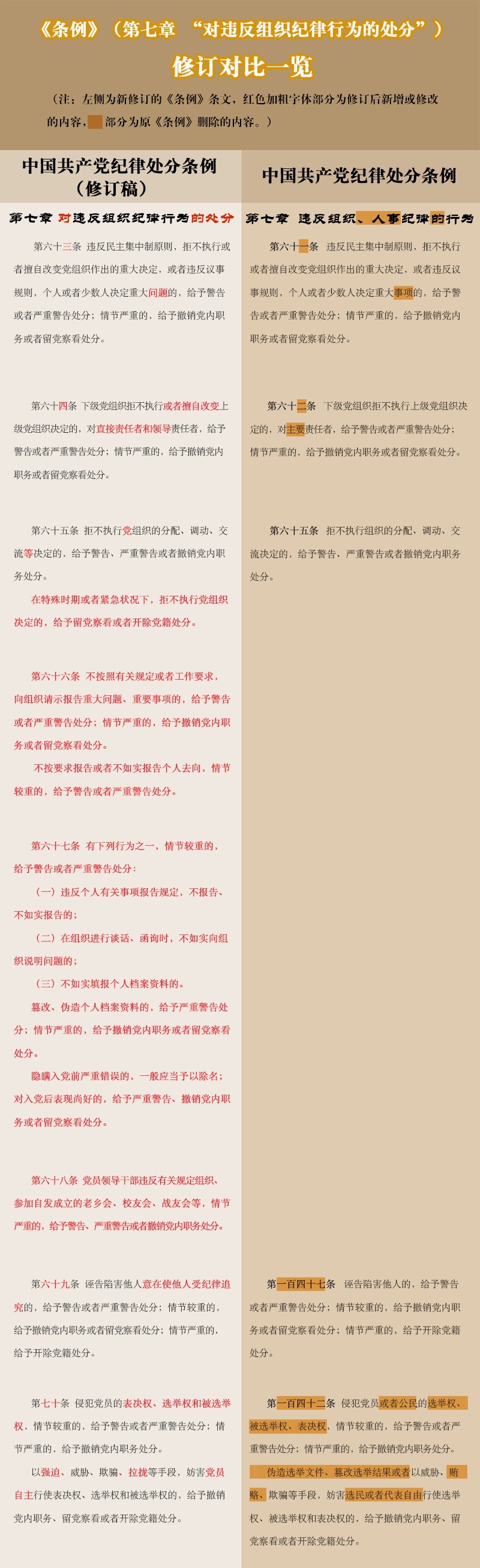 新修訂的《中國共產黨紀律處分條例》第七章“對違反組織紀律行為的處分”,主要對違反民主集中制原則、違背“四個服從”要求的違紀行為作出處分規定。增加了不按照有關規定或者工作要求向組織請示報告重大問題,不如實報告個人有關事項,篡改、偽造個人檔案資料,隱瞞入黨前嚴重錯誤,黨員領導干部違反有關規定組織、參加自發成立的老鄉會、校友會、戰友會,違規取得國(境)外居留權或者外國國籍,違規辦理因私出國(境)證件等違紀條款。
