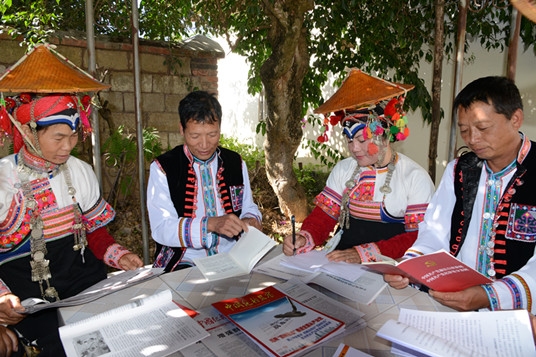 峨山縣多措并舉,嚴字當頭,快字為先,實字為本,制定宣講輔導方案。縣級領導率先垂范帶頭宣講,層層落實宣傳貫徹十八屆五中全會精神的政治責任,學習宣傳好《中國共產黨廉潔自律準則》和《中國共產黨紀律處分條例》。突出“先”字抓學習,突出“廣”字抓宣傳,突出“實”字抓教育,通過媒體廣泛宣傳,干部全面宣講和專題輔導,用彝、漢、哈尼族等語言組織全縣黨員學習《準則》和《條例》,百姓宣講團巡回宣講九期,征訂學習資料1200份,組織400多名科級及以上干部參加了黨風廉政建設知識考試,迅速興起學習熱潮。圖為小街街道辦事處水車田村黨總支書記張家榮組織村三委干部通過《中國紀檢監察報》、《中國紀檢監察》等報刊雜志集中學習《準則》和《條例》。