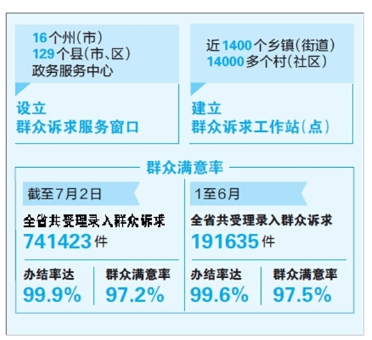 這是一組引人注目的數據:截至7月2日,全省“五級聯動”監督平臺共受理錄入群眾訴求741423件,辦結率達99.9%,群眾滿意率達97.2%。