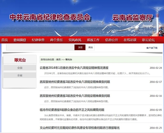 2014年,云南省紀委在官方網站開設“紀律審查”和“曝光臺”欄目,對全省的案件查處情況和典型問題進行點名道姓公開曝光。對案件查處情況曝光更直接,不再出現“某某”字樣;對典型問題曝光更加詳細,有分析有要求,真正對違紀者形成震懾。據統計,2015年以來,云南省紀委監察廳網站點名道姓曝光案件查處情況和典型問題558件次,其中曝光案件查處情況267件次,通報違反中央八項規定精神問題128起、群眾身邊的“四風”問題127起、落實“兩個責任”不力的5起和其他問題31起,釋放出“越往后執紀越嚴”的強烈信號。
