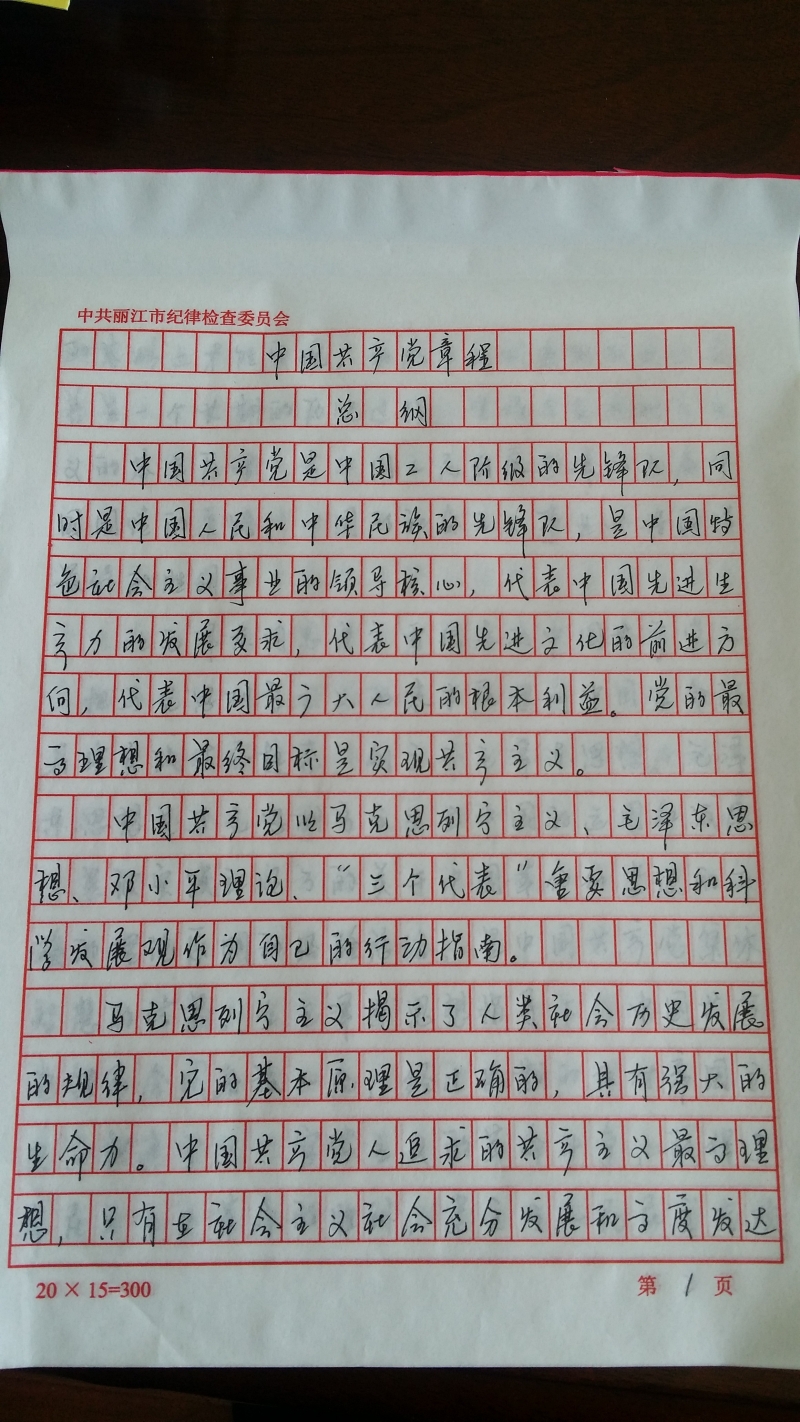 自麗江市全體黨員“兩學(xué)一做”學(xué)習(xí)教育啟動以來,全體紀(jì)檢監(jiān)察干部按照中央、省委、市委部署要求,認(rèn)真開展學(xué)習(xí)教育,在學(xué)習(xí)教育中走在前面、深學(xué)一層,作出示范,積極營造學(xué)黨章、遵黨規(guī)、守黨紀(jì)的濃厚氛圍,嚴(yán)格遵守國家法律法規(guī),爭做“忠誠干凈擔(dān)當(dāng)”表率。并開展每名黨員干部手抄一遍黨章活動,以《中國共產(chǎn)黨章程》《中國共產(chǎn)黨廉潔自律準(zhǔn)則》《中國共產(chǎn)黨紀(jì)律處分條例》為重點(diǎn)內(nèi)容,采取自學(xué)手抄、黨章黨規(guī)網(wǎng)絡(luò)知識測試、知識競賽等相結(jié)合的方式進(jìn)行學(xué)習(xí)。其中,自學(xué)手抄環(huán)節(jié)以手抄黨章為主,通過手眼并用,讓黨章意識入腦入心,切實(shí)把黨章這個(gè)總規(guī)矩立起來,刻印在每一名黨員的心頭上,落實(shí)到每一天的行動中。