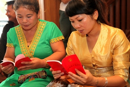 7月13日,西雙版納傣族自治州景洪市嘎灑鎮曼景罕村民小組洋溢著喜慶的氣氛,西雙版納編譯的《中國共產黨章程》傣文版發放儀式在這里舉行,12000余本傣文版的黨章將全部發到每一個傣族黨員的手中。