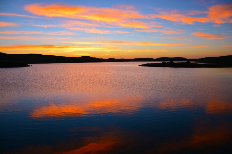 大山包湖泊,水域?qū)掗煟趟{天,湖光山色,遙相輝映,庫中島嶼,神似蓬萊,水鳥珍禽,出沒風(fēng)波里。