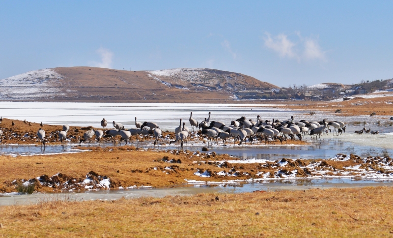 大山包濕地內(nèi)泉眼密布,水質(zhì)清純,草甸花叢,流水潺潺,沼澤湖泊,星羅棋布,是黑頸鶴的重要夜宿地和覓食地。