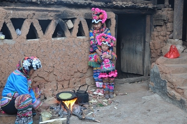 火塘邊的米飯已噴噴香,火塘上的雜鍋菜咕嚕咕嚕的冒著泡,這就是彝家人一日兩餐的標配。