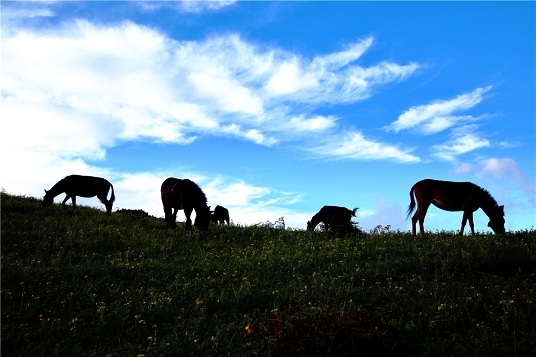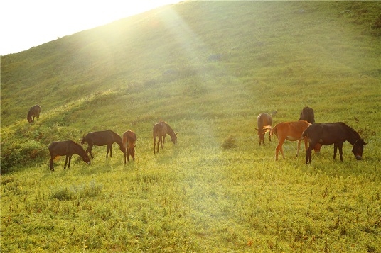 “十一”前后,仙人腦綠草依依,如夢如幻,金燦燦的野花把萬畝草甸裝扮得分外妖嬈,成群的牛馬安靜地在山坡上吃草,并不時傳來蟲鳴鳥語之聲,讓人入靜。
