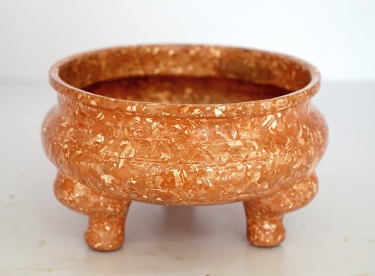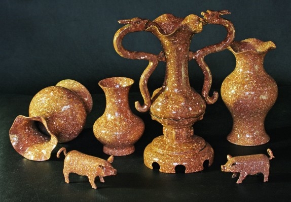 用“千錘百煉”來形容會澤斑銅,再合適不過了。斑銅工藝品“妙在有斑,貴在渾厚”,其制作采用會澤特有的天然銅,采用高溫熔融制斑、整形、煮斑、露斑、拋光等20余道工序,煅燒幾十次,敲打幾萬錘方能定型,一件斑銅器物要歷時兩個月多才能完成。用這種方法做出的香爐、花瓶、筆筒等工藝品,在橘紅色的基面上,均勻地布滿了黃白交燦的晶斑,晶斑具有折光性、富有立體感,宛若若干細小的水晶石鑲嵌在表面,看似凹凸不平實則光滑如玉。整體來看,錚亮璀璨、金赤交輝、晶瑩閃爍、光彩照人,富麗而不失凝重,古樸而不失典雅。]被鑒賞家譽為“金屬寶石”。