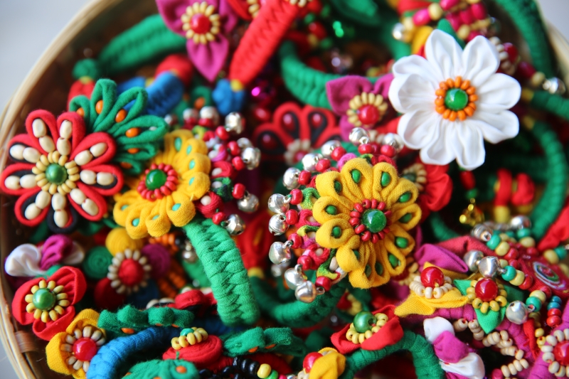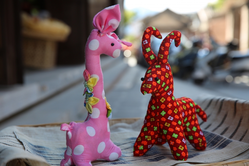 踏上老舊的青石板,穿過狹長的雨巷,步入古街中心,兩旁的商鋪里,琳瑯滿目的手工藝品讓人眼前一亮,布藝玩偶、手串、壁飾應有盡有,讓人應接不暇。