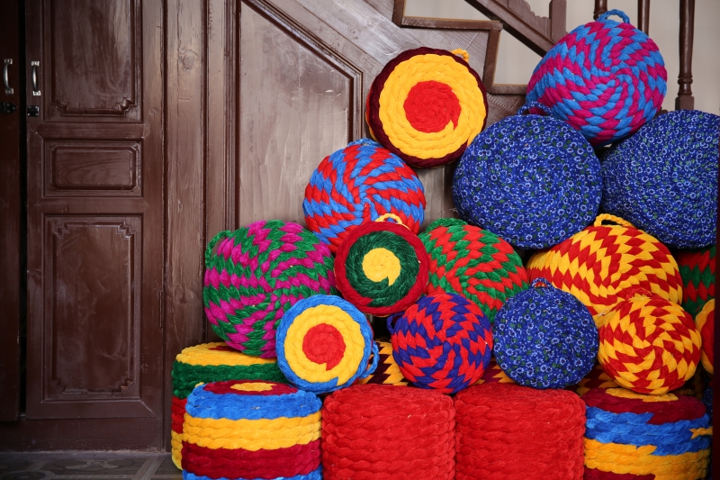 一旁,料理完家務的農婦圍坐在一起,一邊聊著家常里短,一邊坐著手工,有的正用針線結扎花樣,有的正忙著縫制杯墊、零錢包等小物。