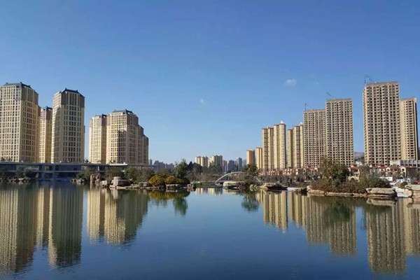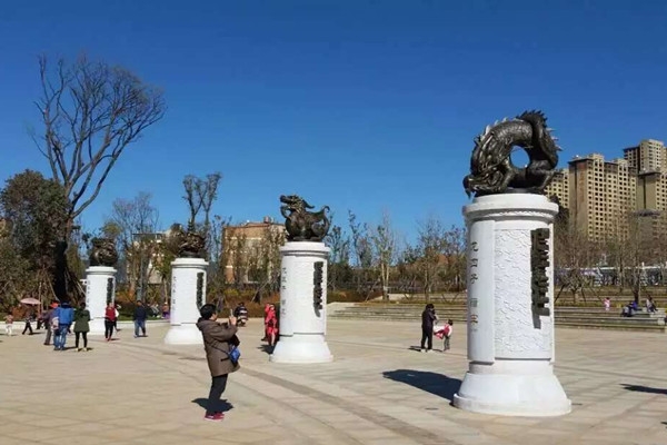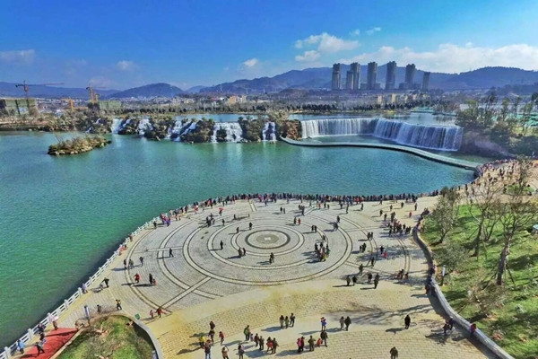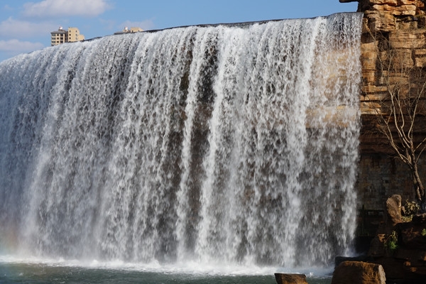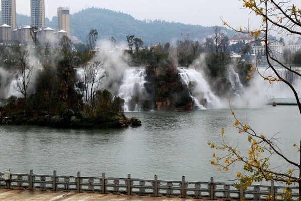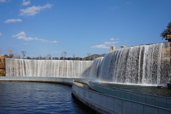 昆明瀑布公園,又名牛欄江瀑布公園,位于盤龍江松華壩下游2.3公里處,通過利用約12.5米的地勢高差,建成寬幅約400米的人工瀑布。