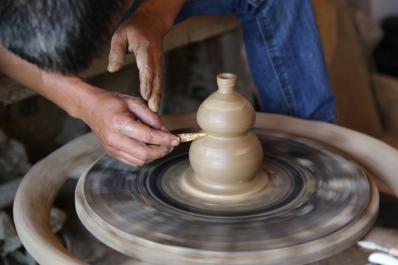 黑陶制作的關(guān)鍵是取土,土分多層,因?yàn)椴牧系姆謩e并非每一層都適合燒制黑陶,需要多年的經(jīng)驗(yàn)來甄別、剝離。頭年掏的土要擱置到第三年才砸碎分揀,其他所有的工序都有意識(shí)的遲緩下去,以求在整個(gè)制作鏈中土性充分軟化,重金屬和其他有害物質(zhì)充分釋放,最大限度地保證黑陶的自然和環(huán)保。