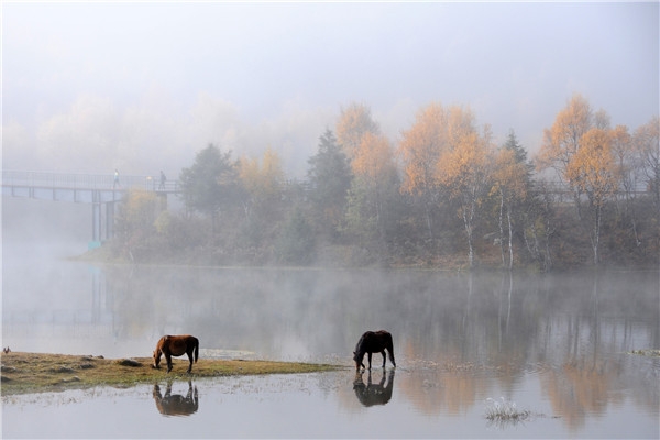 天色破曉,夜霧慢慢散去,像輕紗一般的迷霧籠罩著的屬都湖湖面。令人有種身處夢幻仙境的感覺。