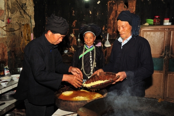 蒸制金黃色的糯米飯作祭祀太陽貢品