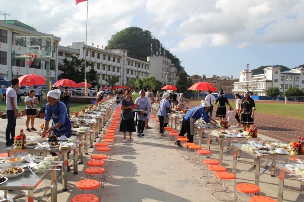 文藝展演活動結(jié)束后,游客們可以感受“壯家長街宴”的熱鬧和美味。這里的菜品均為八寶壯族特色菜,有鵝粉蒸、鴨子捂糯飯、清蒸鯰魚、豆沙肉、粽粑、搭褳粑、面蒿粑、黃姜粑等等。