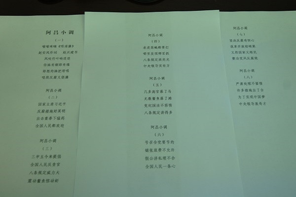 “黨紀國法不容情,老虎蒼蠅都要打,哪里發現哪里抓,嗦嗦咪唻……”阿昌群眾唱“廉歌”