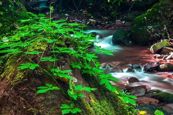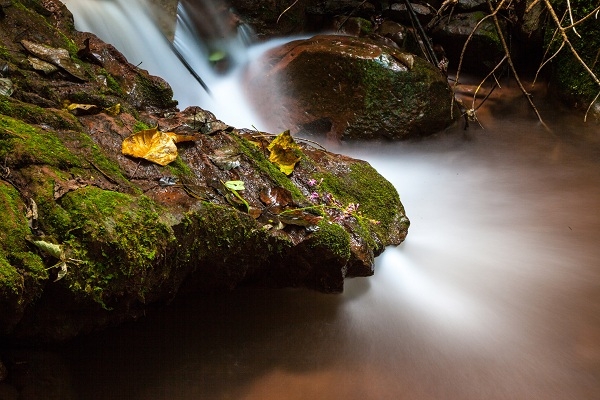 山澗里落滿黃葉,滿是苔蘚,水流輕快
