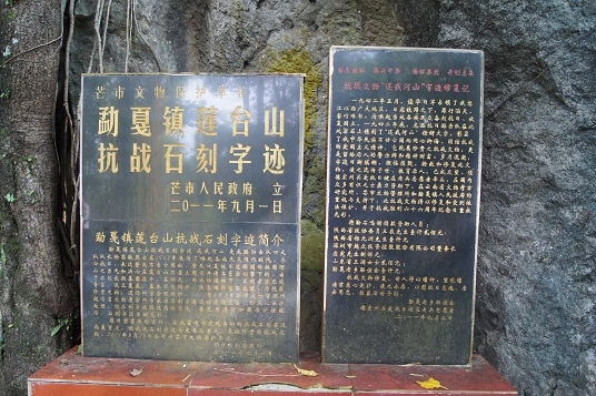 楊思敬于1942年秋在芒市勐戛鎮蓮臺山觀音寺旁題寫四個大字“還我河山”,并請勐戛鎮芒往村石匠朱發行雕刻在山壁的巖石上。