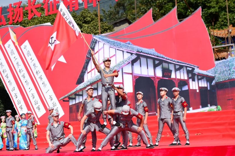 “紅軍不怕遠(yuǎn)征難,萬水千山只等閑……”在演員們鏗鏘有力的合唱聲中,主題為“弘揚(yáng)長征精神、決勝全面小康”的紀(jì)念紅軍長征勝利80周年大會文藝演出正式拉開帷幕。演出分為《紅色長征路》和《奮進(jìn)新昭通》上下篇。臺上演員傾情演出,臺下觀眾掌聲雷動,彩旗招展。舞蹈《扎西風(fēng)云》、歌伴舞《 紅哥哥》、音詩畫《血染烏蒙》等11個精彩節(jié)目贏得了場上陣陣掌聲。演出在歌伴舞《共筑中國夢》的精彩演出中結(jié)束。