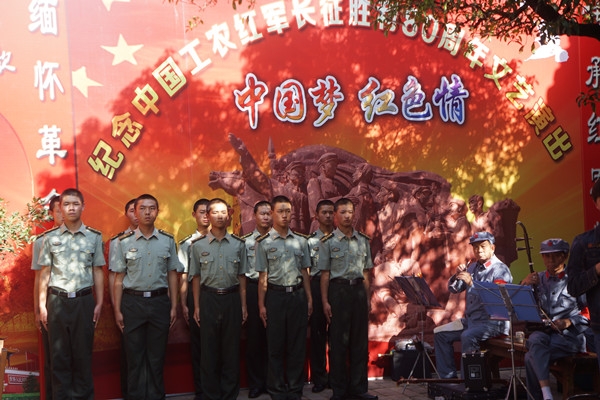 “中國夢·紅色情”紀念紅軍長征勝利80周年文藝演出在經典旋律《紅軍不怕遠征難》中拉開序幕,舞蹈《十送紅軍》《萬泉河水清又清》《山丹丹花開紅艷艷》等一個個節目緬懷了革命先輩的豐功偉績,謳歌了蕩氣回腸的長征精神。