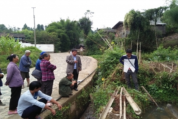 木料塘邊調(diào)解糾紛(右二)