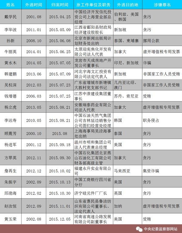 2015年“百名紅通”到案的18人中,“一把手”比例超過一半