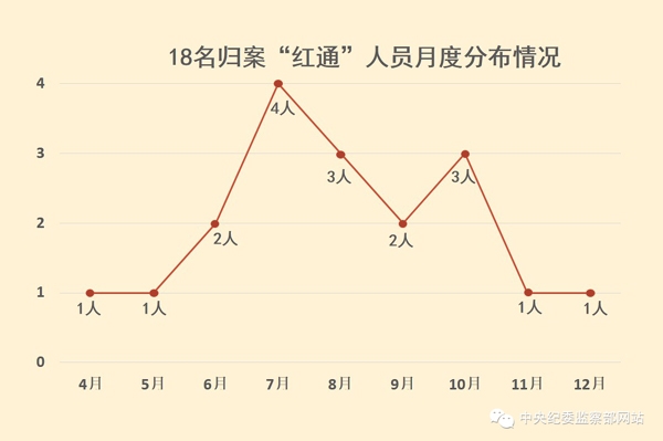 《首名紅色通緝令嫌犯今日落網》、《“紅色通緝令”2號嫌犯李華波被遣返回國》、《“百名紅通人員”楊進軍被從美國強制遣返回國》……細數中央紀委監察部網站反腐敗國際追逃追贓專欄,可以一目了然地看出紅通人員到案的時間軸。4月公布名單以來,每個月都有紅通人員歸案,7月歸案人數最多。