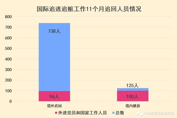 “百名紅通”18人到案是代表性成果,但這只是2015年國際反腐敗追逃追贓成果的一部分。而國際追逃追贓工作截至2015年11月一共追回了863人,其中黨員和國家工作人員196人,從境外追回738人。