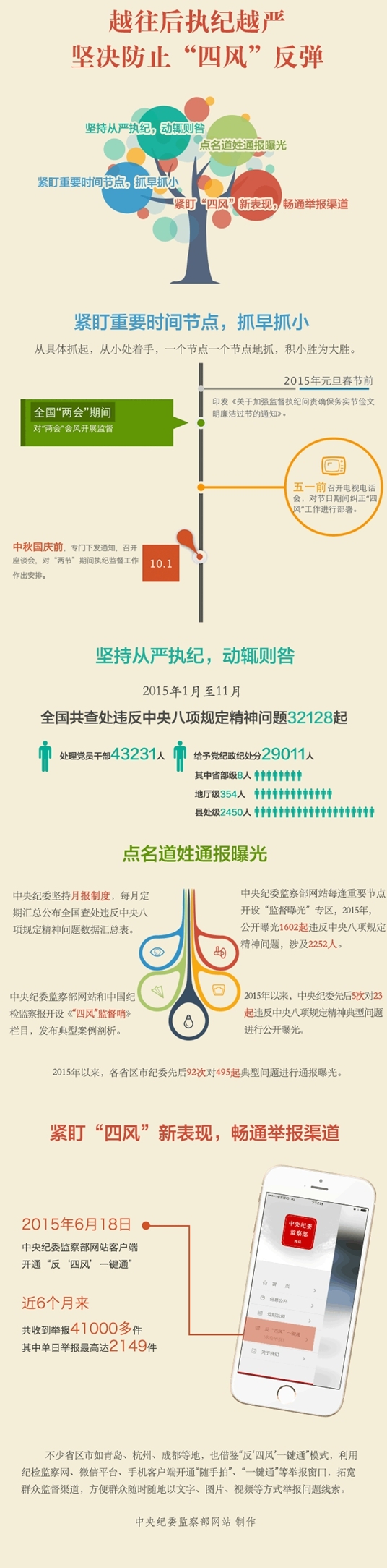 2015年元旦春節(jié)前,中央紀(jì)委印發(fā)《關(guān)于加強(qiáng)監(jiān)督執(zhí)紀(jì)問(wèn)責(zé)確保務(wù)實(shí)節(jié)儉文明廉潔過(guò)節(jié)的通知》,對(duì)“兩節(jié)”期間糾正“四風(fēng)”工作作出部署;全國(guó)“兩會(huì)”期間,對(duì)“兩會(huì)”會(huì)風(fēng)開(kāi)展監(jiān)督;五一前,召開(kāi)強(qiáng)化監(jiān)督執(zhí)紀(jì)問(wèn)責(zé)深入糾正“四風(fēng)”電視電話(huà)會(huì)議,對(duì)節(jié)日期間糾正“四風(fēng)”工作進(jìn)行部署;中秋國(guó)慶前,中央紀(jì)委向全國(guó)紀(jì)檢監(jiān)察機(jī)關(guān)下發(fā)通知,要求早研究、早部署、早警示;并組織召開(kāi)座談會(huì),對(duì)“兩節(jié)”期間執(zhí)紀(jì)監(jiān)督工作作出安排。每個(gè)重要時(shí)間節(jié)點(diǎn)前夕,中央紀(jì)委監(jiān)察部網(wǎng)站都會(huì)開(kāi)通“四風(fēng)”問(wèn)題監(jiān)督舉報(bào)曝光專(zhuān)區(qū),每周集中通報(bào)曝光一批典型問(wèn)題,強(qiáng)化震懾。