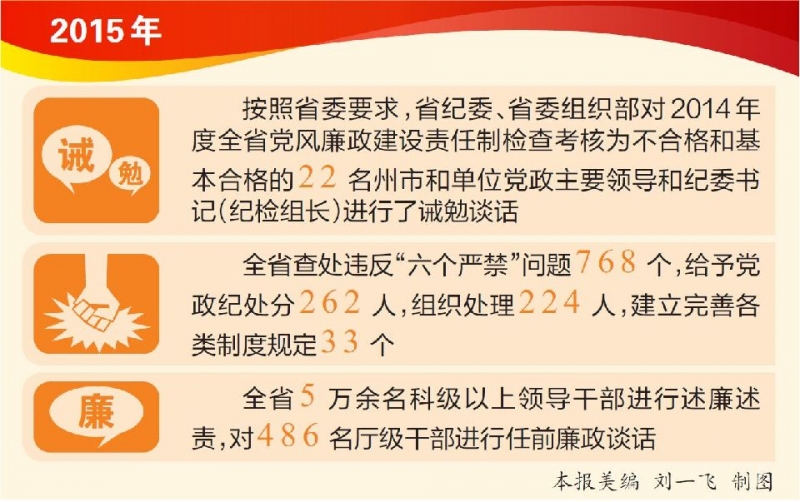 數據更有說服力。2015年,全省紀檢監察機關共收到信訪舉報31856件(次),立案5441件,其中,廳級干部55人,縣處級干部277人,給予黨紀政紀處分5809人。