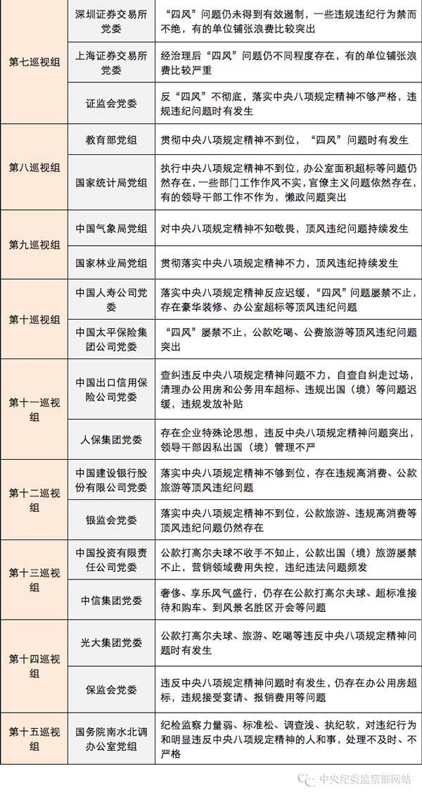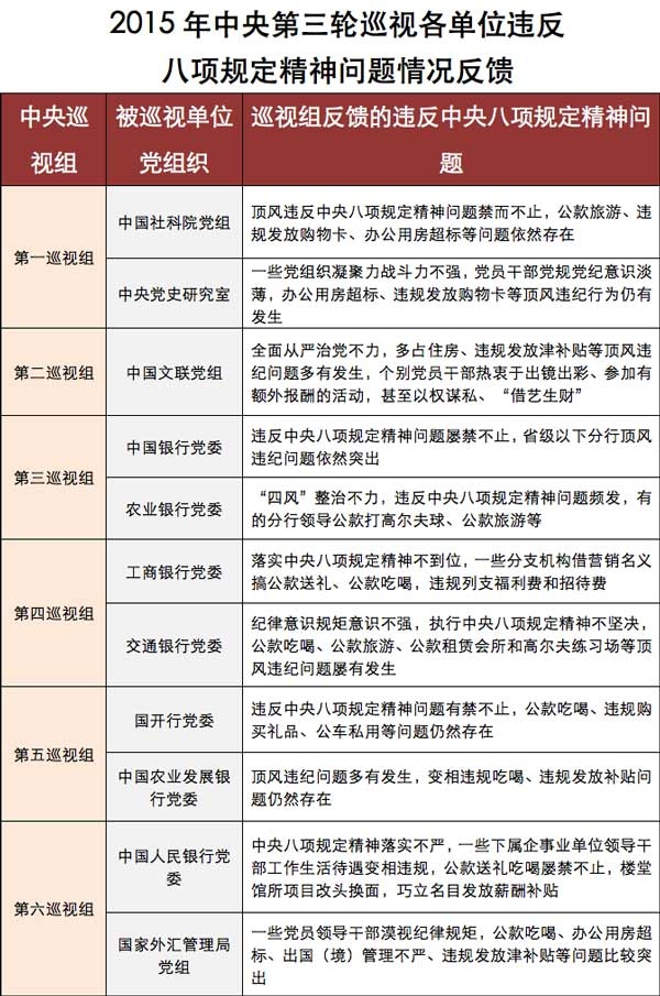 梳理十八大以來中央和各省區市巡視工作,有一個特點頗為明顯:同樣是違反中央八項規定精神,地區、部門、單位不同,其突出問題和表現形式也略有差異:巡視央企和金融單位,公款吃喝、公費旅游、違規高消費、違規發放津補貼是不少單位的“通病”;巡視省區市,形式主義、官僚主義,領導干部違規多占住房、吃拿卡要、為官不為等問題被曝光較多;各省區市巡視下屬地區和單位,公款吃喝,超標準接待,文山會海,收受下屬禮金“紅包”等,又常常成為干部群眾反映強烈的問題……