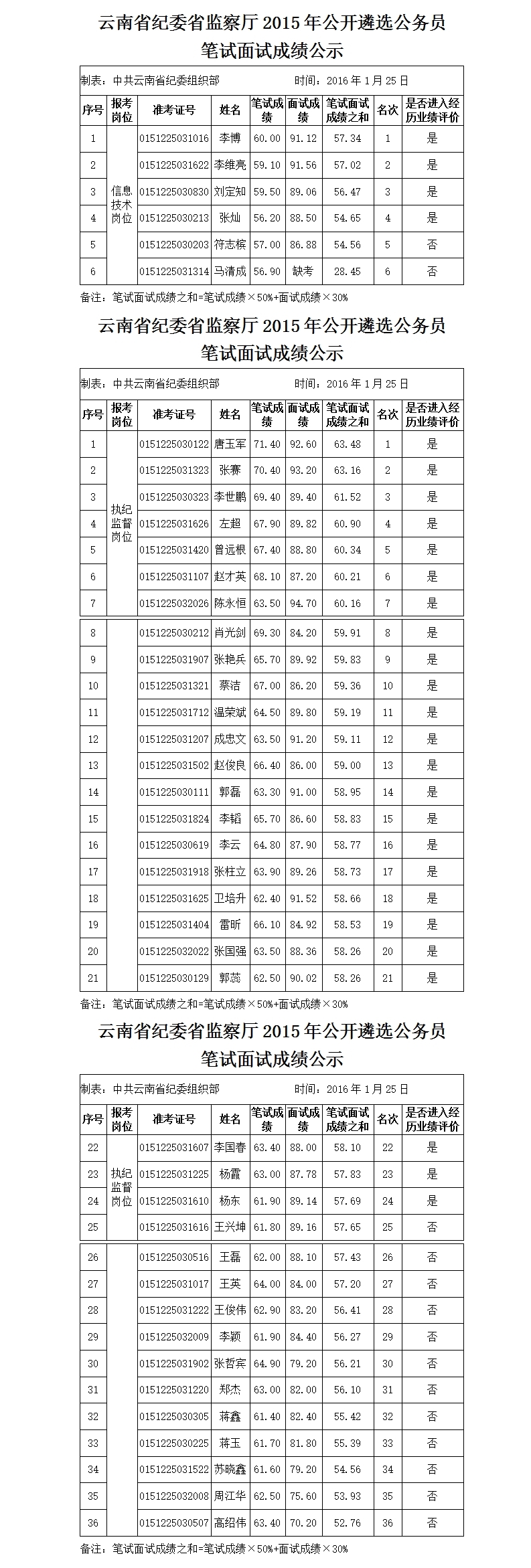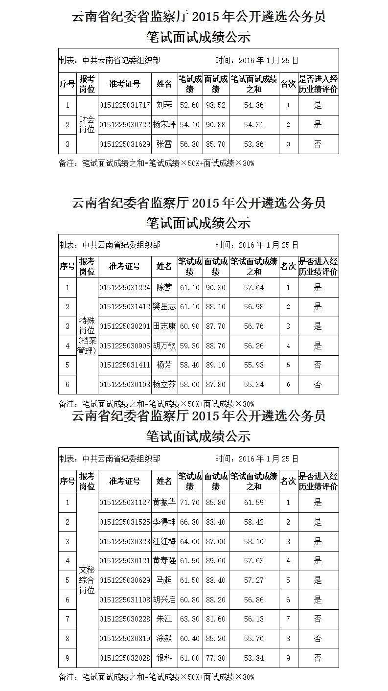 云南省紀委省監(jiān)察廳2015年公開遴選公務員筆試面試成績公示