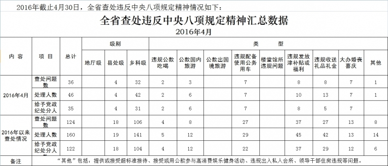 2016年4月,全省各級紀檢監察機關查處違反中央八項規定精神問題36起,處理46人,給予黨政紀處分35人。