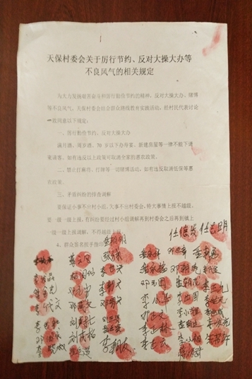 在天保村委會辦公室,村黨委書記、村委會主任劉德明拿出了一沓“村規民約”,共26份,每個村小組1份。其中禁止村民濫辦酒席的規定里,只有“滿月酒、周歲酒、70歲以下辦壽宴、新建房屋等一律不能下請柬情況,如有違反以上政策可取消全家的惠農政策”這一句話。從字面上看,這是一份簡單得不能在簡單的“村規民約”。但這26份“村規民約”與全面、嚴謹、規范的機關文件相比,不同的是上面密密麻麻寫滿了全村968戶戶主的姓名,并蓋上了村民自己鮮紅的手印。劉德明說:“過去就是因缺了這份簡單的村規民約,全村也因濫辦酒席被搞得得亂七八糟,老百姓整天忙著吃酒,既傷財還耽誤工時,弄得老百姓都無心生產”。