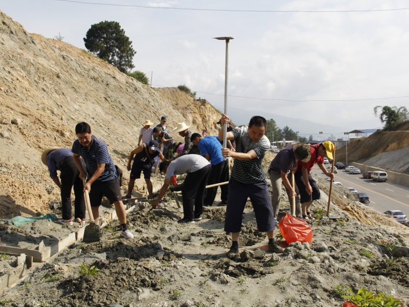 植樹現(xiàn)場(chǎng),大家三四個(gè)人一組,有的清理著坑塘四周及塘內(nèi)的石礫雜物,有的揮動(dòng)鐵鍬給樹苗培土,有的正為剛栽下的樹苗澆定根水和回土……每道工序都做得十分認(rèn)真,大家齊心協(xié)力、相互配合,為臨滄城種下一株株樹苗,一片片荒山頃刻間變得綠意盎然。