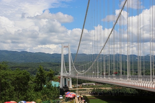 位于高黎貢山西南側的龍江特大橋,橋面離江面280米,最高的索塔頂到江面470米,主橋跨徑布置為320米+1196米+320米,是云南省首座特大跨徑鋼箱梁懸索橋,建成后將成為亞洲最大的山區懸索橋。(保山市紀委 楊耀西 保山市政府高黎貢山旅游度假區紀工委 鄭云峰)