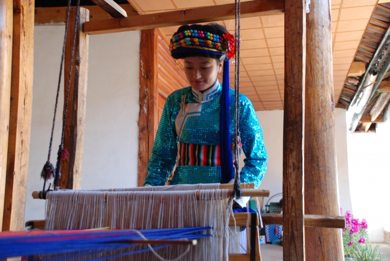 摩梭婦女在紡麻織布