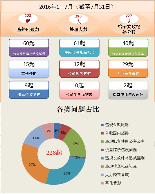今年1至7月,云南省各級紀檢監(jiān)察機關查處違反中央八項規(guī)定精神問題228起,處理290人,給予黨政紀處分227人。從查處問題類別看,違規(guī)發(fā)放津補貼或福利問題60起,占26.3%;違規(guī)收送禮品禮金問題61起,占26.7%;違規(guī)配備使用公務用車問題40起,占17.5%;大辦婚喪喜慶問題29起,占12.7%;違規(guī)公款吃喝問題9起,占4%;公款國內旅游問題12起,占5.2%;樓堂館所違規(guī)問題2起,占1%;其他問題15起,占6.6%。