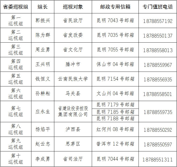 巡視期間,各巡視組均設(shè)立了郵政專用信箱和專門值班電話。省民政廳、省發(fā)改委、省文化廳、騰沖市、云南民族大學(xué)、馬關(guān)縣、省建設(shè)投資控股集團(tuán)有限公司、瀘西縣、思茅區(qū)和省司法廳的巡視郵政專用信箱和值班電話如下。
