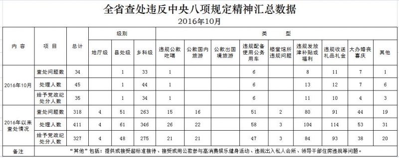 2016年10月,全省各級紀檢監察機關緊盯“中秋、國慶”重要時間節點,進一步加大監督執紀問責力度,查處違反中央八項規定精神問題34起,處理45人,給予黨政紀處分35人。從查處問題類別看,違規收送禮品禮金問題11起,占32.35%;違規發放津補貼或福利問題8起,占23.53%;大辦婚喪喜慶問題7起,占20.59%;違規配備使用公務用車問題6起,占17.65%;違規公款吃喝1起,占2.94%;其他問題1起,占2.94%。