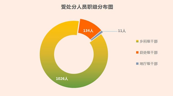 從職級來看,受處分人員中,鄉科級干部1026人,占88%,縣處級干部134人,占11%,地廳級干部11人。