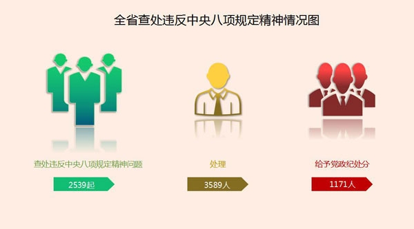 中央八項規定實施以來,截至2016年10月31日,全省已累計查處違反中央八項規定精神問題2539起、處理3589人,給予黨紀政紀處分1171人。