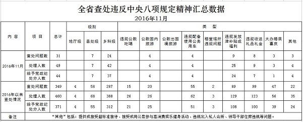 2016年11月,全省各級(jí)紀(jì)檢監(jiān)察機(jī)關(guān)持續(xù)加大監(jiān)督執(zhí)紀(jì)問責(zé)力度,查處違反中央八項(xiàng)規(guī)定精神問題31起,處理49人,給予黨政紀(jì)處分44人。從查處問題類別看,違規(guī)發(fā)放津補(bǔ)貼或福利問題9起,占29.03%;違規(guī)收送禮品禮金問題8起,占25.81%;違規(guī)配備使用公務(wù)用車問題4起,占12.90%;公款國(guó)內(nèi)旅游4起,占12.90%;大辦婚喪喜慶問題3起,占9.68%;其他問題3起,占9.68%。