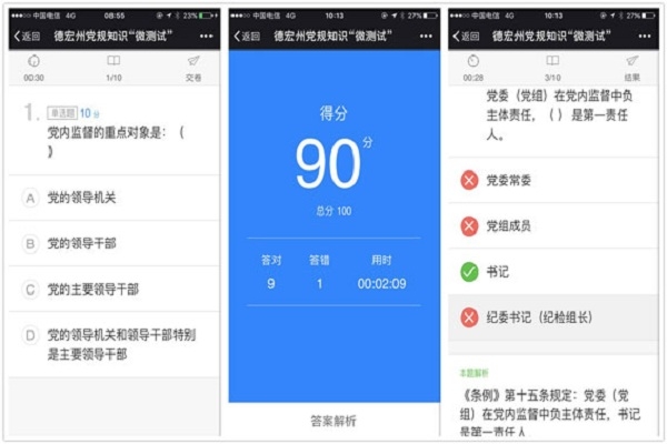 德宏州黨規知識“微測試”,以《中國共產黨廉潔自律準則》《中國共產黨紀律處分條例》《中國共產黨問責條例》《關于新形勢下黨內政治生活的若干準則》《中國共產黨黨內監督條例》等黨內法規和德宏州相關紀律規定為內容,每月進行一次,每次選一部黨內法規進行“微測試”。而此次以《中國共產黨黨內監督條例》為主要內容,全州各級各部門在職黨員干部參加“微測試”。