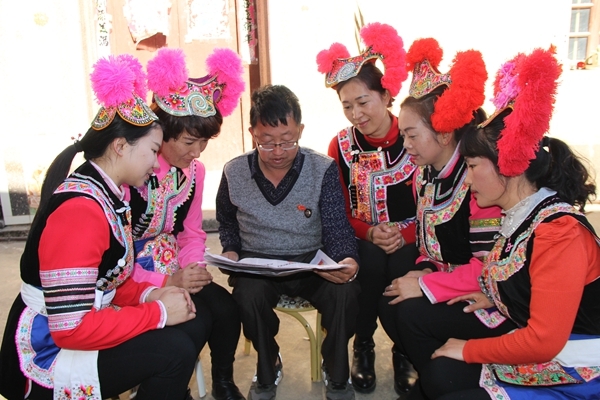 團結街道大興社區(qū)彝族書記李國標在農(nóng)家小院和彝族黨員熱議全會精神