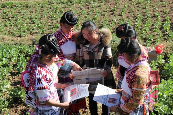 團結街道大興社區(qū)苗族干部李淑蕓在田間地頭和苗族干部群眾熱議全會精神